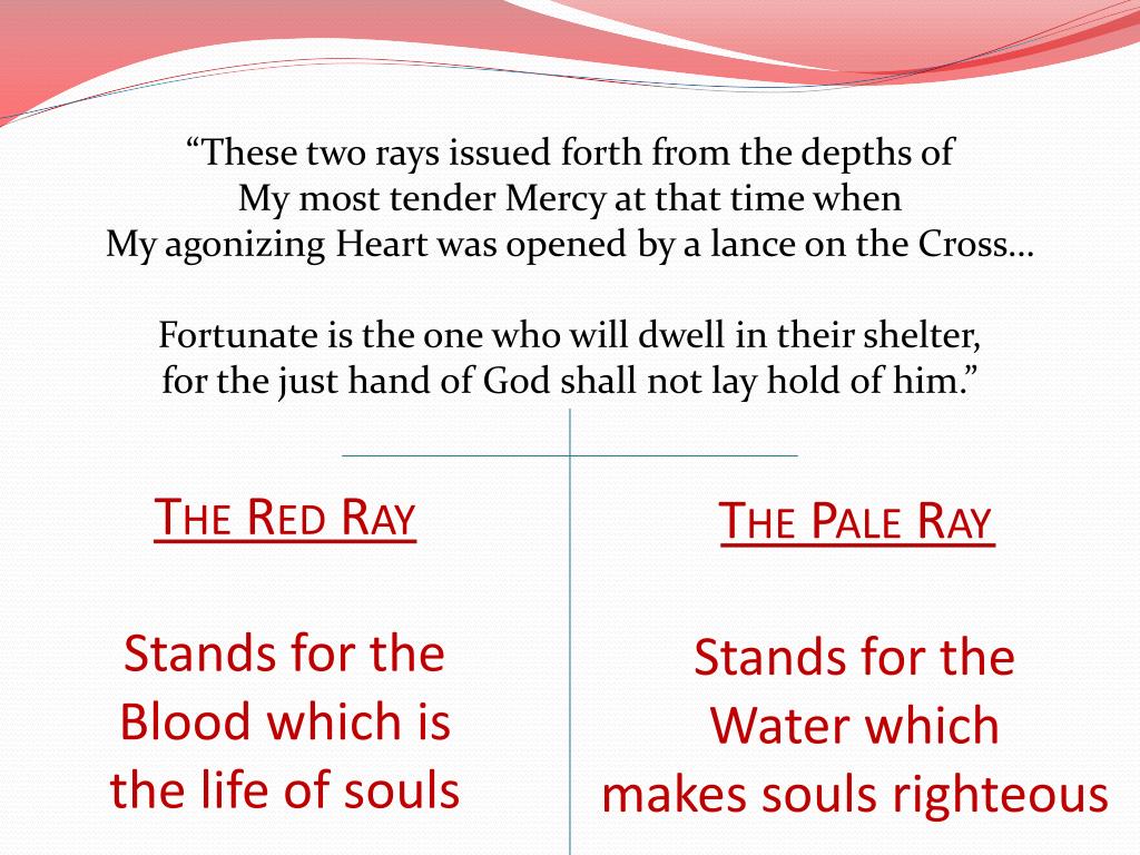 The Red Ray Stands for the Blood which is the life of soulsThe Pale Ray Stands for the Water which makes souls righteous “These two rays issued forth from the depths of My most tender Mercy at that time when My agonizing Heart was opened by a lance on the Cross… Fortunate is the one who will dwell in their shelter, for the just hand of God shall not lay hold of him.”