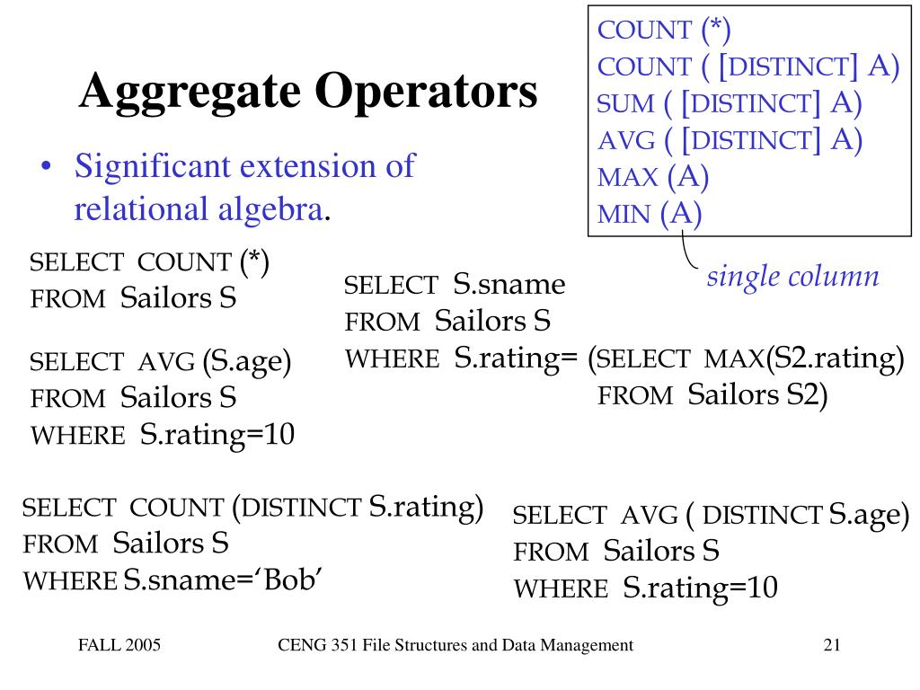 More on Set-Comparison Operators • We’ve already seen IN, EXISTS and UNIQUE. Can also use NOT IN, NOT EXISTS and NOT UNIQUE. • Also available: op ANY, op ALL, op IN • Find sailors whose rating is greater than some sailor called Horatio: SELECT * FROM Sailors S WHERE S.rating > ANY(SELECT S2.rating FROM Sailors S2 WHERE S2.sname=‘Horatio’) CENG 351 File Structures and Data Management