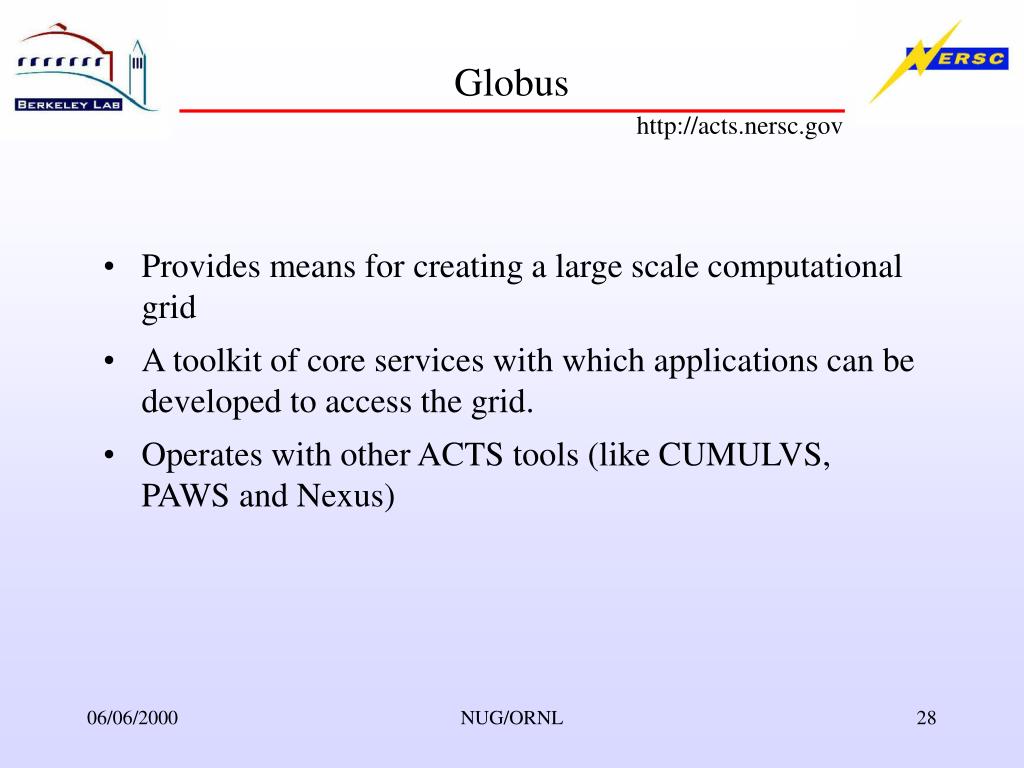 Globus • Provides means for creating a large scale computational grid • A toolkit of core services with which applications can be developed to access the grid. • Operates with other ACTS tools (like CUMULVS, PAWS and Nexus) NUG/ORNL