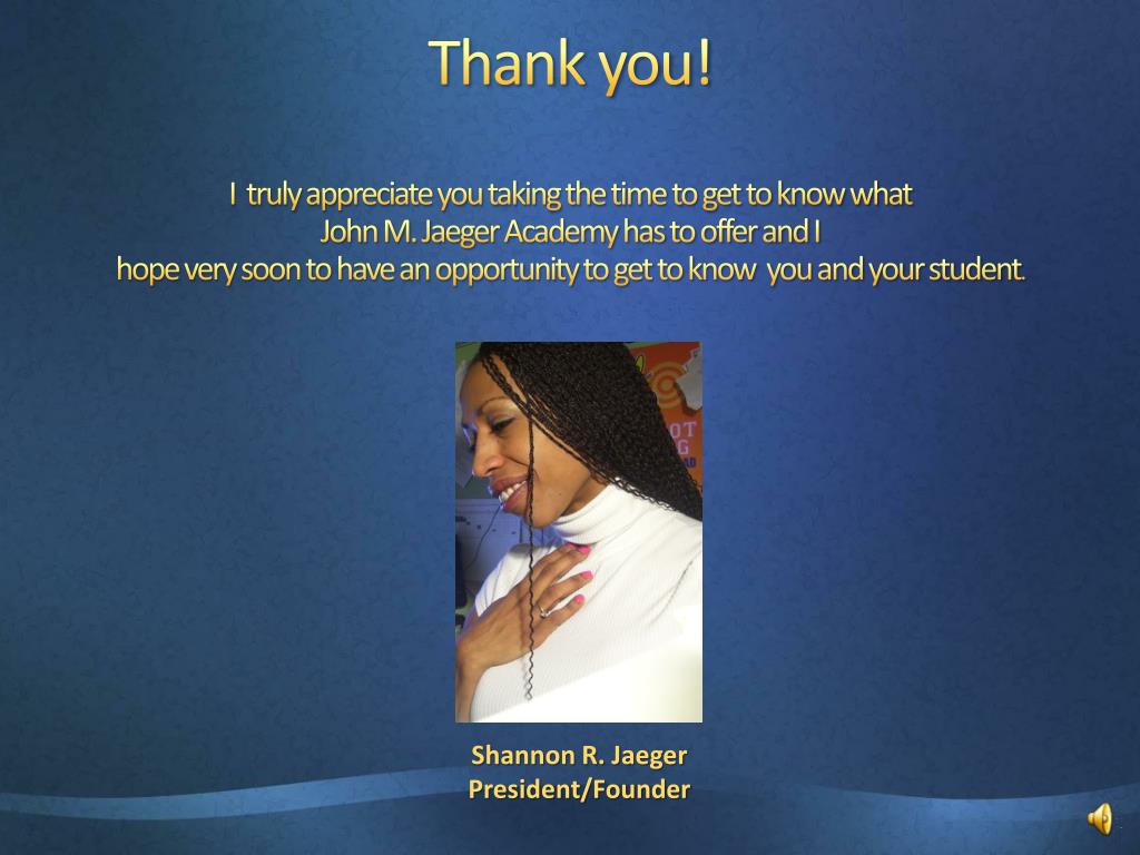 Thank you!I truly appreciate you taking the time to get to know what John M. Jaeger Academy has to offer and Ihope very soon to have an opportunity to get to know you and your student. Shannon R. Jaeger President/Founder
