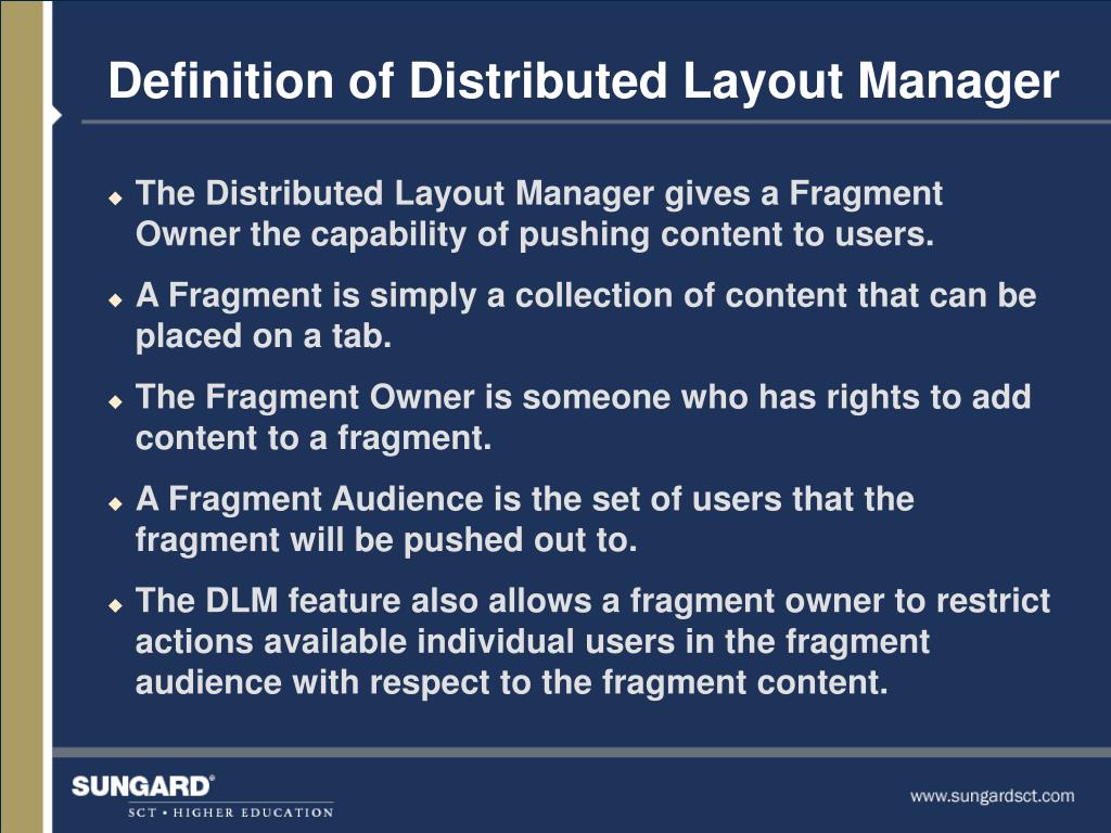 Overview of Distributed Layout Manager. Presented by: Mark Boyd, SunGard SCT Marlin Benson, SunGard SCT Todd Trann, University of Saskatchewan. Definition of Distributed Layout Manager. The Distributed Layout Manager gives a Fragment Owner the capability of pushing content to users.