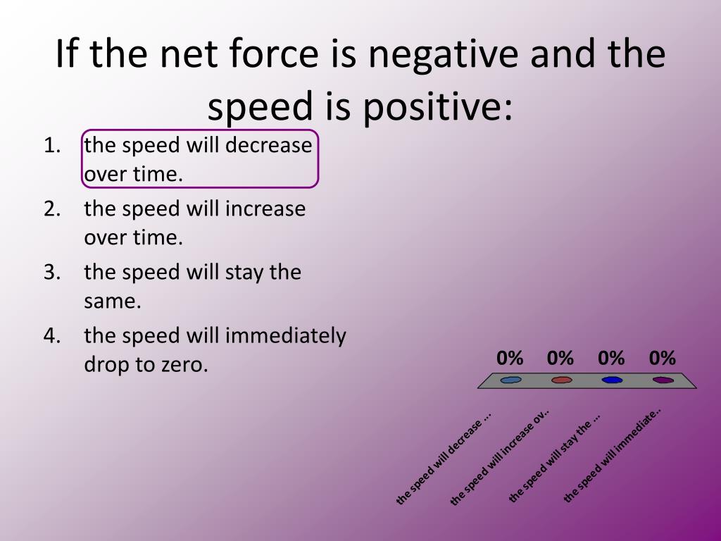 If the net force is negative and the speed is positive: • the speed will decrease over time. • the speed will increase over time. • the speed will stay the same. • the speed will immediately drop to zero.