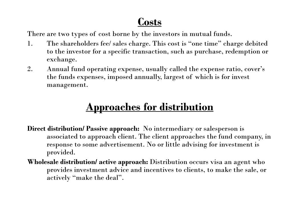 Costs • There are two types of cost borne by the investors in mutual funds. • 1. The shareholders fee/ sales charge. This cost is “one time” charge debited to the investor for a specific transaction, such as purchase, redemption or exchange. • Annual fund operating expense, usually called the expense ratio, cover’s the funds expenses, imposed annually, largest of which is for invest management. • Approaches for distribution • Direct distribution/ Passive approach: No intermediary or salesperson is associated to approach client. The client approaches the fund company, in response to some advertisement. No or little advising for investment is provided. • Wholesale distribution/ active approach: Distribution occurs visa an agent who provides investment advice and incentives to clients, to make the sale, or actively “make the deal”.