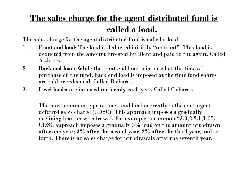The sales charge for the agent distributed fund is called a load. The sales charge for the agent distributed fund is called a load. 1. Front end load: The load is deducted initially “up front”. This load is deducted from the amount invested by client and paid to the agent. Called A shares. 2. Back end load: While the front end load is imposed at the time of purchase of the fund, back end load is imposed at the time fund shares are sold or redeemed. Called B shares. 3. Level loads: are imposed uniformly each year. Called C shares. The most common type of back-end load currently is the contingent deferred sales charge (CDSC). This approach imposes a gradually declining load on withdrawal. For example, a common “3,3,2,2,1,1,0”. CDSC approach imposes a gradually 3% load on the amount withdrawn after one year; 3% after the second year, 2% after the third year, and so forth. There is no sales charge for withdrawals after the seventh year.