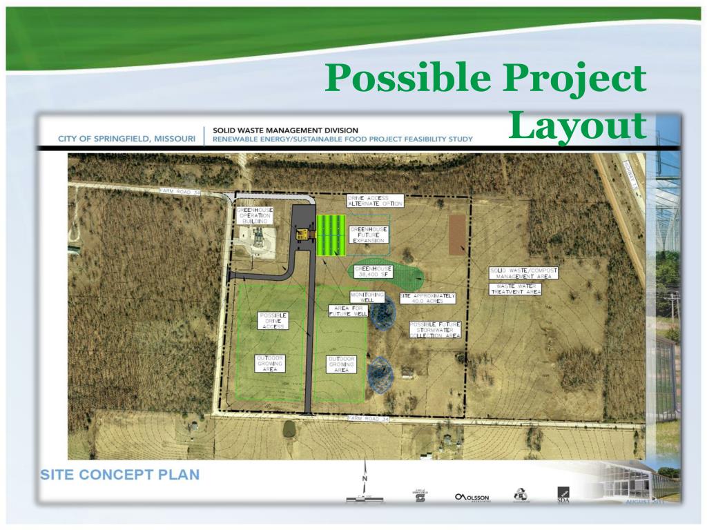 Current Project Status • Initial Market research and feasibility study are complete. • Springfield City Council and other team members are trying to develop a plan for moving forward. • Funding sources, design details, crops, and partner/ operator are factors that have to be resolved as we move forward. • Public meeting is scheduled for May 8, 2013 to present the project top a group of potential partners, community leaders, and others interested in the project.