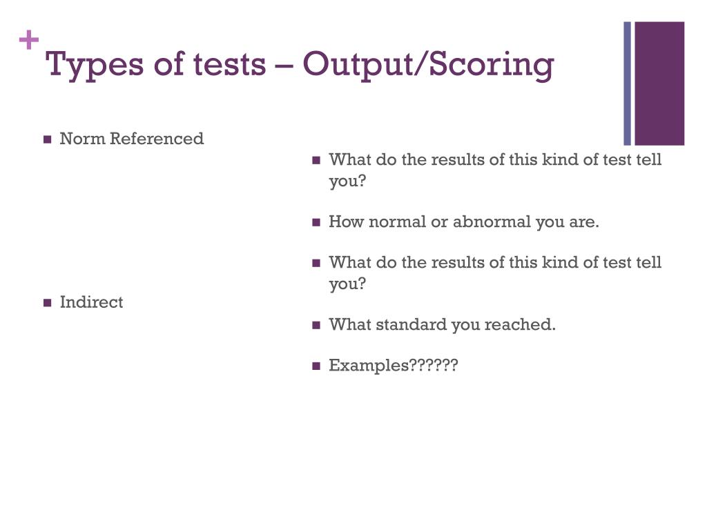 Types of tests – Output/Scoring • Norm Referenced • Indirect • What do the results of this kind of test tell you? • How normal or abnormal you are. • What do the results of this kind of test tell you? • What standard you reached. • Examples??????