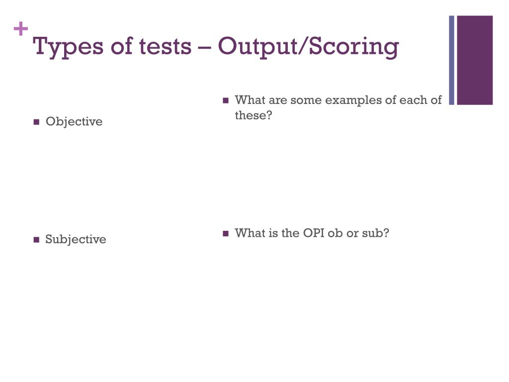 Types of tests – Output/Scoring • Objective • Subjective • What are some examples of each of these? • What is the OPI ob or sub?