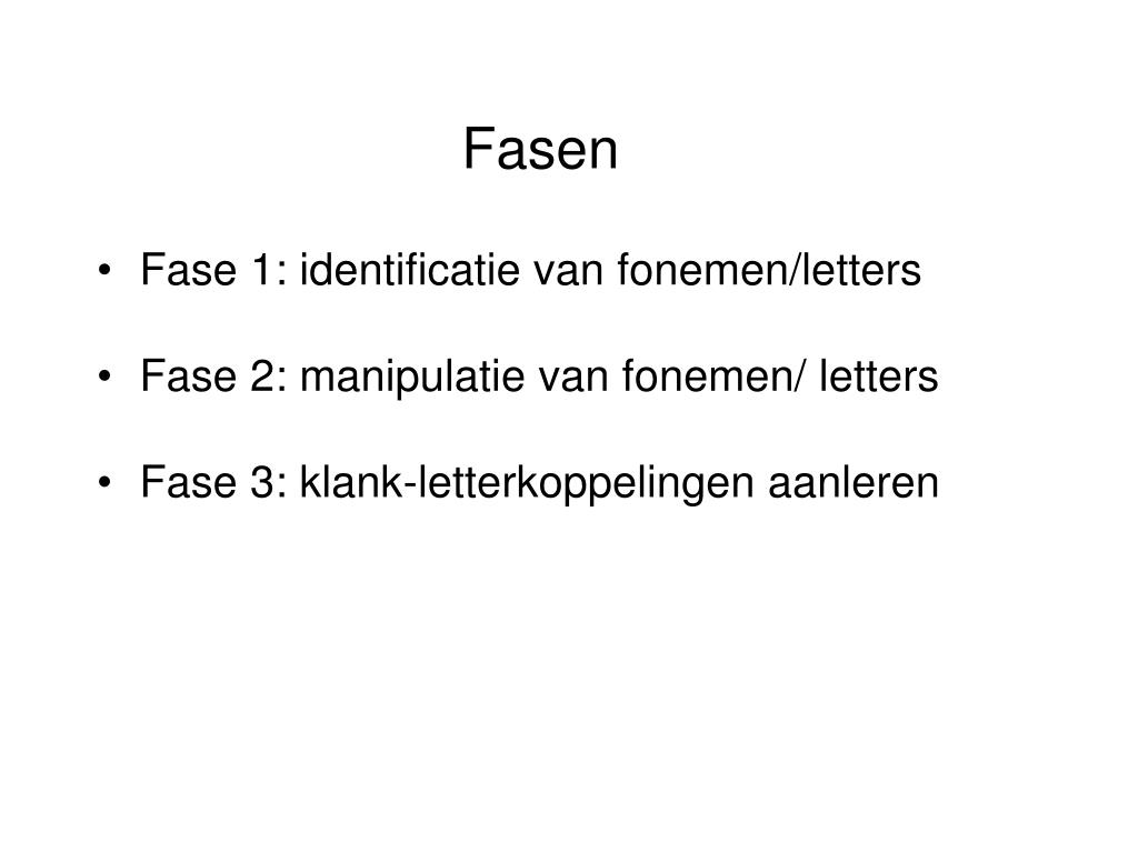 Fasen • Fase 1: identificatie van fonemen/letters • Fase 2: manipulatie van fonemen/ letters • Fase 3: klank-letterkoppelingen aanleren