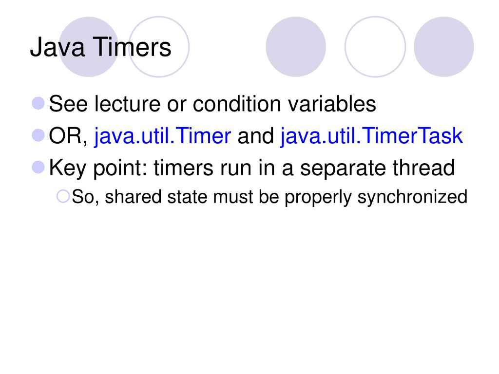 Java Timers • See lecture or condition variables • OR, java.util.Timer and java.util.TimerTask • Key point: timers run in a separate thread • So, shared state must be properly synchronized