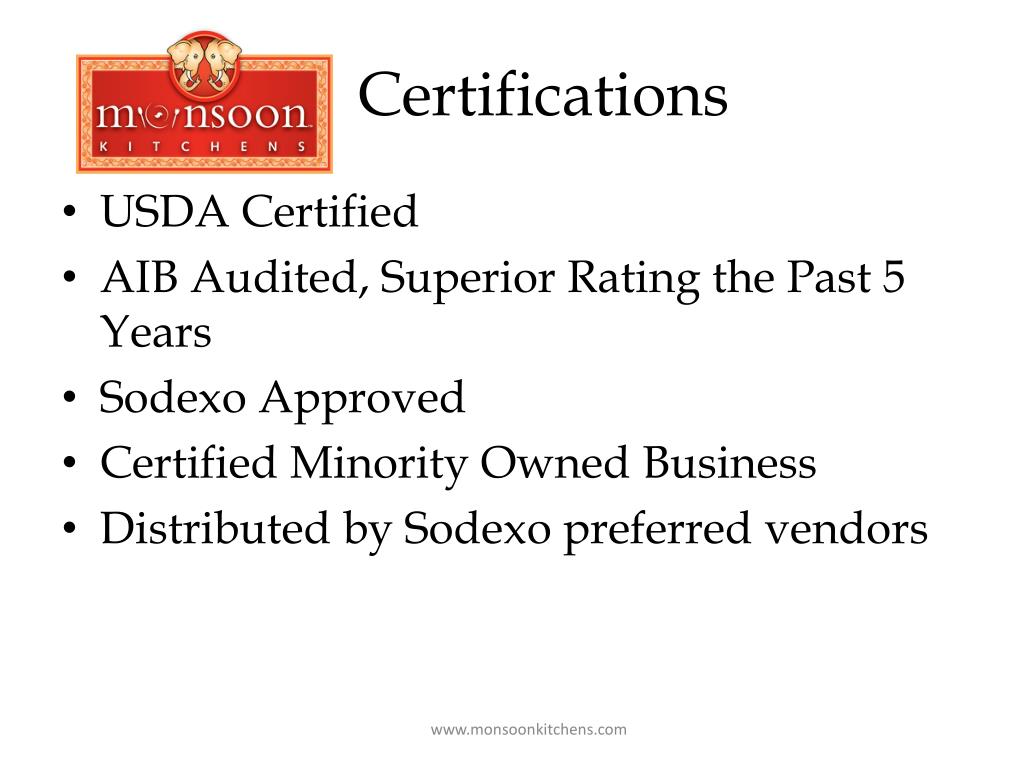 Certifications • USDA Certified • AIB Audited, Superior Rating the Past 5 Years • Sodexo Approved • Certified Minority Owned Business • Distributed by Sodexo preferred vendors www.monsoonkitchens.com