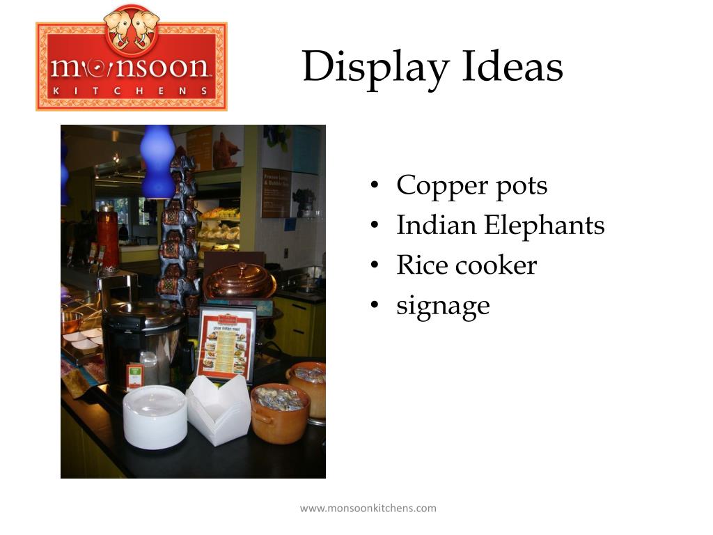 Display Ideas • Copper pots • Indian Elephants • Rice cooker • signage www.monsoonkitchens.com