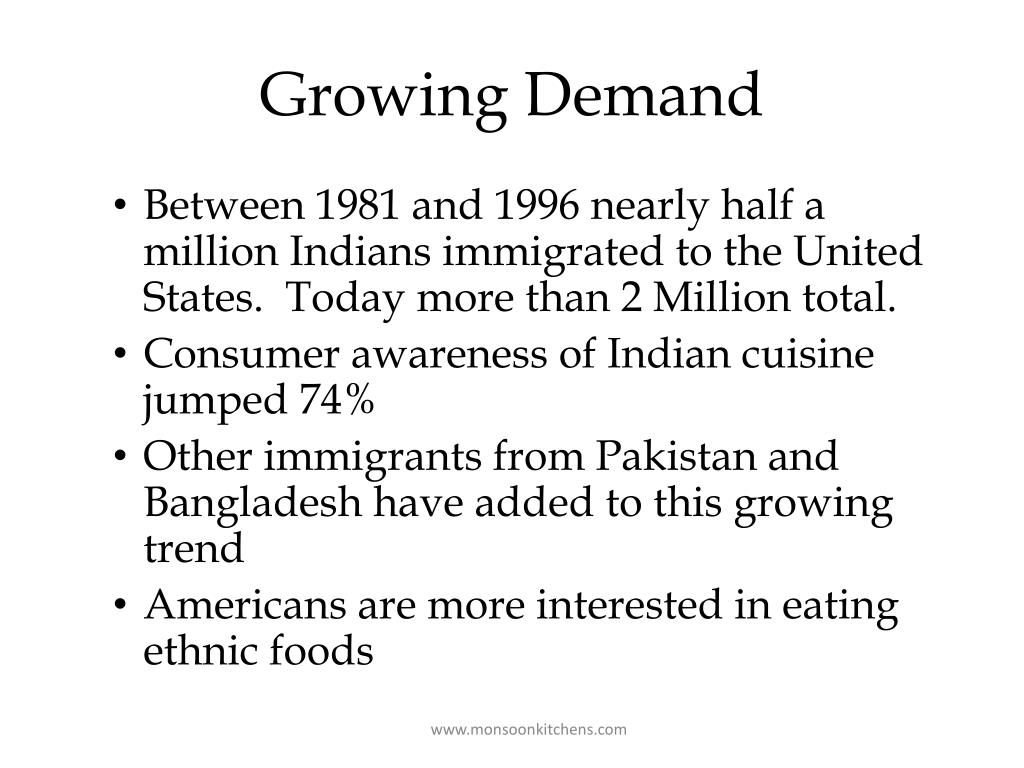 Growing Demand • Between 1981 and 1996 nearly half a million Indians immigrated to the United States. Today more than 2 Million total. • Consumer awareness of Indian cuisine jumped 74% • Other immigrants from Pakistan and Bangladesh have added to this growing trend • Americans are more interested in eating ethnic foods www.monsoonkitchens.com