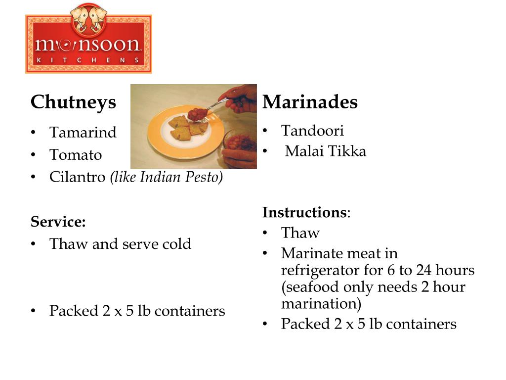 Chutneys Marinades Tandoori Malai Tikka Instructions: Thaw Marinate meat in refrigerator for 6 to 24 hours (seafood only needs 2 hour marination) Packed 2 x 5 lb containers • Tamarind • Tomato • Cilantro (like Indian Pesto) Service: • Thaw and serve cold • Packed 2 x 5 lb containers
