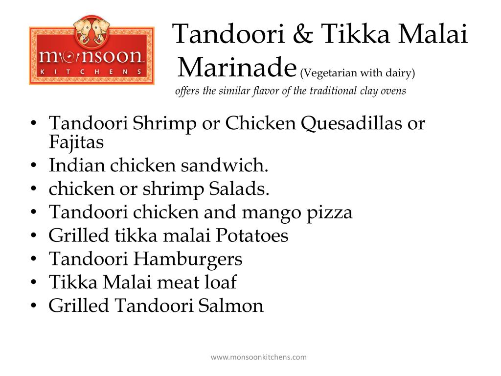 Tandoori & Tikka Malai Marinade (Vegetarian with dairy)offers the similar flavor of the traditional clay ovens • Tandoori Shrimp or Chicken Quesadillas or Fajitas • Indian chicken sandwich. • chicken or shrimp Salads. • Tandoori chicken and mango pizza • Grilled tikkamalai Potatoes • Tandoori Hamburgers • Tikka Malai meat loaf • Grilled Tandoori Salmon www.monsoonkitchens.com