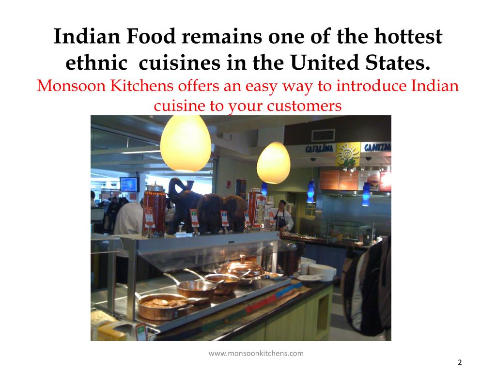 Indian Food remains one of the hottest ethnic cuisines in the United States.Monsoon Kitchens offers an easy way to introduce Indian cuisine to your customers www.monsoonkitchens.com