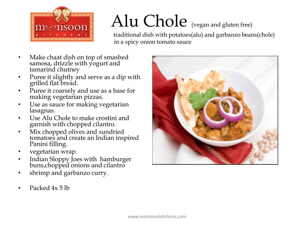 AluChole(vegan and gluten free) traditional dish with potatoes(alu) and garbanzo beans(chole) in a spicy onion tomato sauce • Make chaat dish on top of smashed samosa, drizzle with yogurt and tamarind chutney • Puree it slightly and serve as a dip with grilled flat bread. • Puree it coarsely and use as a base for making vegetarian pizzas. • Use as sauce for making vegetarian lasagnas. • Use AluChole to make crostini and garnish with chopped cilantro. • Mix chopped olives and sundried tomatoes and create an Indian inspired Panini filling. • vegetarian wrap. • Indian Sloppy Joes with hamburger buns,chopped onions and cilantro • shrimp and garbanzo curry. • Packed 4x 5 lb www.monsoonkitchens.com