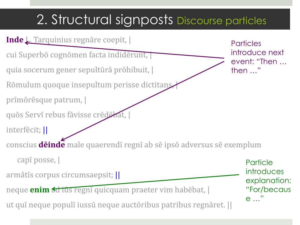 IndeL. Tarquiniusregnārecoepit, | cui Superbōcognōmenfactaindidērunt, | quiasocerumgenersepultūrāprōhibuit, | Rōmulumquoqueinsepultumperissedictitans, | prīmōrēsquepatrum, | quōsServī rebus fāvissecrēdēbat, | interfēcit; || consciusdēindemale quaerendīregnīabsēipsōadversussē exemplum capī posse, | armātīs corpus circumsaepsit; || nequeenimad iūsregnīquicquampraeter vim habēbat, | utquīnequepopulīiussūnequeauctōribuspatribusregnāret. || 2. Structural signposts Discourse particles Particles introduce next event: “Then … then …” Particle introduces explanation: “For/because …”