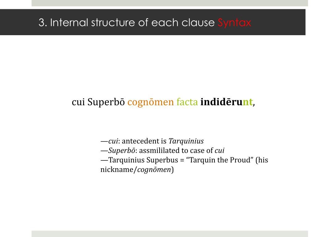 3. Internal structure of each clause Syntax cui Superbōcognōmenfactaindidērunt, —cui: antecedent is Tarquinius —Superbō: assmililated to case of cui —TarquiniusSuperbus = “Tarquin the Proud” (his nickname/cognōmen)