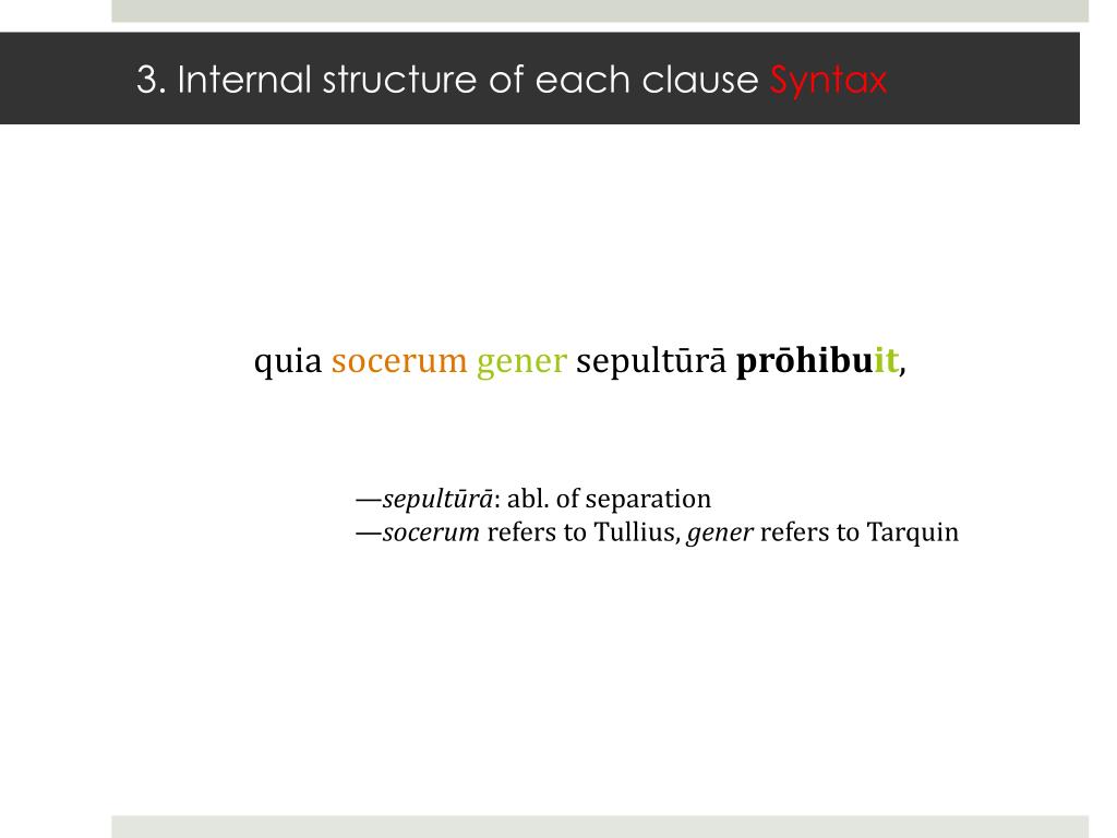 3. Internal structure of each clause Syntax quiasocerumgenersepultūrāprōhibuit, —sepultūrā: abl. of separation —socerum refers to Tullius, gener refers to Tarquin