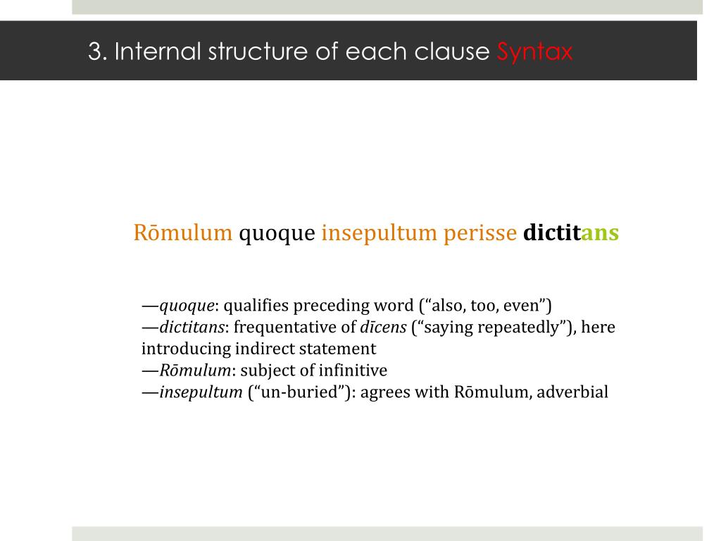 3. Internal structure of each clause Syntax Rōmulumquoqueinsepultumperissedictitans —quoque: qualifies preceding word (“also, too, even”) —dictitans: frequentative of dīcens (“saying repeatedly”), here introducing indirect statement —Rōmulum: subject of infinitive —insepultum (“un-buried”): agrees with Rōmulum, adverbial