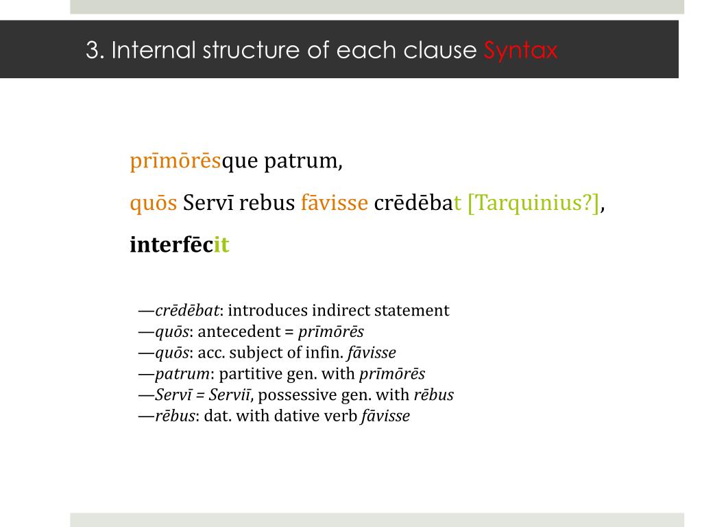 3. Internal structure of each clause Syntax prīmōrēsquepatrum, quōsServī rebus fāvissecrēdēbat[Tarquinius?], interfēcit —crēdēbat: introduces indirect statement —quōs: antecedent = prīmōrēs —quōs: acc. subject of infin. fāvisse —patrum: partitive gen. with prīmōrēs —Servī = Serviī, possessive gen. with rēbus —rēbus: dat. with dative verb fāvisse