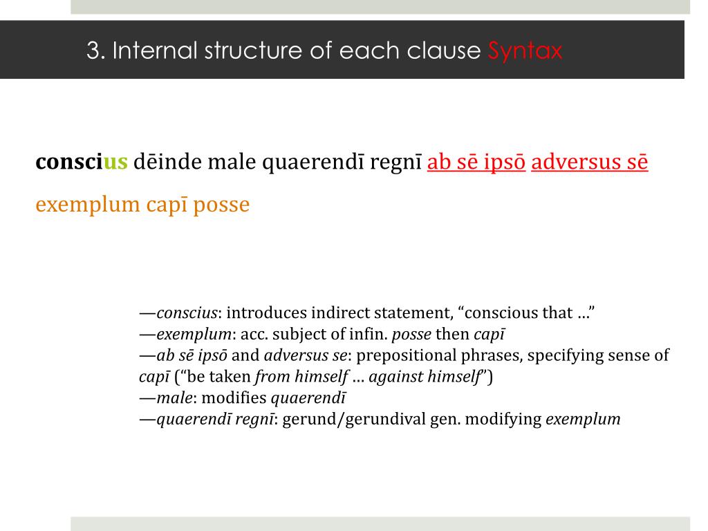 3. Internal structure of each clause Syntax consciusdēinde male quaerendīregnīabsēipsōadversussēexemplum capī posse —conscius: introduces indirect statement, “conscious that …” —exemplum: acc. subject of infin. posse then capī —absēipsō and adversus se: prepositional phrases, specifying sense of capī (“be taken from himself … against himself”) —male: modifies quaerendī —quaerendīregnī: gerund/gerundival gen. modifying exemplum