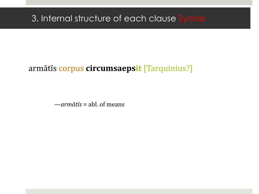 3. Internal structure of each clause Syntax armātīscorpuscircumsaepsit[Tarquinius?] —armātīs= abl. of means