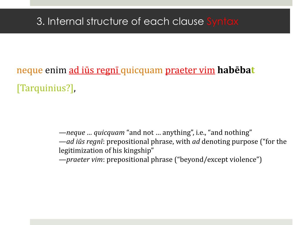 3. Internal structure of each clause Syntax nequeenimad iūsregnīquicquampraeter vimhabēbat[Tarquinius?], —neque … quicquam “and not … anything”, i.e., “and nothing” —ad iūsregnī: prepositional phrase, with ad denoting purpose (“for the legitimization of his kingship” —praeter vim: prepositional phrase (“beyond/except violence”)