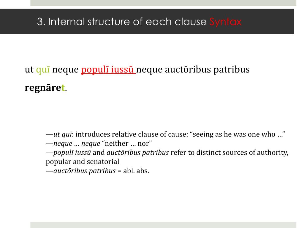 3. Internal structure of each clause Syntax utquīnequepopulīiussūnequeauctōribuspatribusregnāret. —utquī: introduces relative clause of cause: “seeing as he was one who …” —neque … neque “neither … nor” —populīiussū and auctōribuspatribus refer to distinct sources of authority, popular and senatorial —auctōribuspatribus = abl. abs.