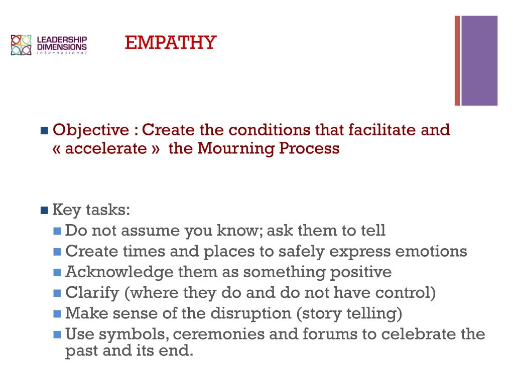 EMPATHY • Objective : Create the conditions that facilitate and « accelerate » the Mourning Process • Key tasks: • Do not assume you know; ask them to tell • Create times and places to safely express emotions • Acknowledge them as something positive • Clarify (where they do and do not have control) • Make sense of the disruption (story telling) • Use symbols, ceremonies and forums to celebrate the past and its end.