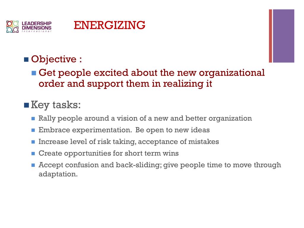 ENERGIZING • Objective : • Get people excited about the new organizational order and support them in realizing it • Key tasks: • Rally people around a vision of a new and better organization • Embrace experimentation. Be open to new ideas • Increase level of risk taking, acceptance of mistakes • Create opportunities for short term wins • Accept confusion and back-sliding; give people time to move through adaptation.