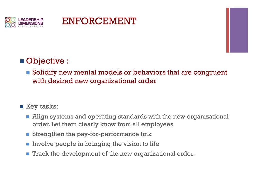 ENFORCEMENT • Objective : • Solidify new mental models or behaviors that are congruent with desired new organizational order • Key tasks: • Align systems and operating standards with the new organizational order. Let them clearly know from all employees • Strengthen the pay-for-performance link • Involve people in bringing the vision to life • Track the development of the new organizational order.
