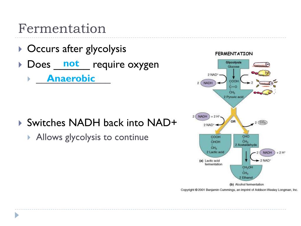 Fermentation • Occurs after glycolysis • Does ______ require oxygen • ______________ • Switches NADH back into NAD+ • Allows glycolysis to continue not Anaerobic