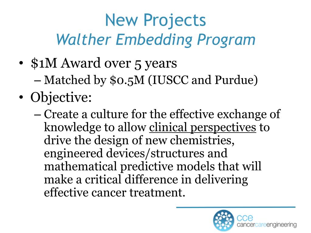 New ProjectsWalther Embedding Program • $1M Award over 5 years • Matched by $0.5M (IUSCC and Purdue) • Objective: • Create a culture for the effective exchange of knowledge to allow clinical perspectives to drive the design of new chemistries, engineered devices/structures and mathematical predictive models that will make a critical difference in delivering effective cancer treatment.