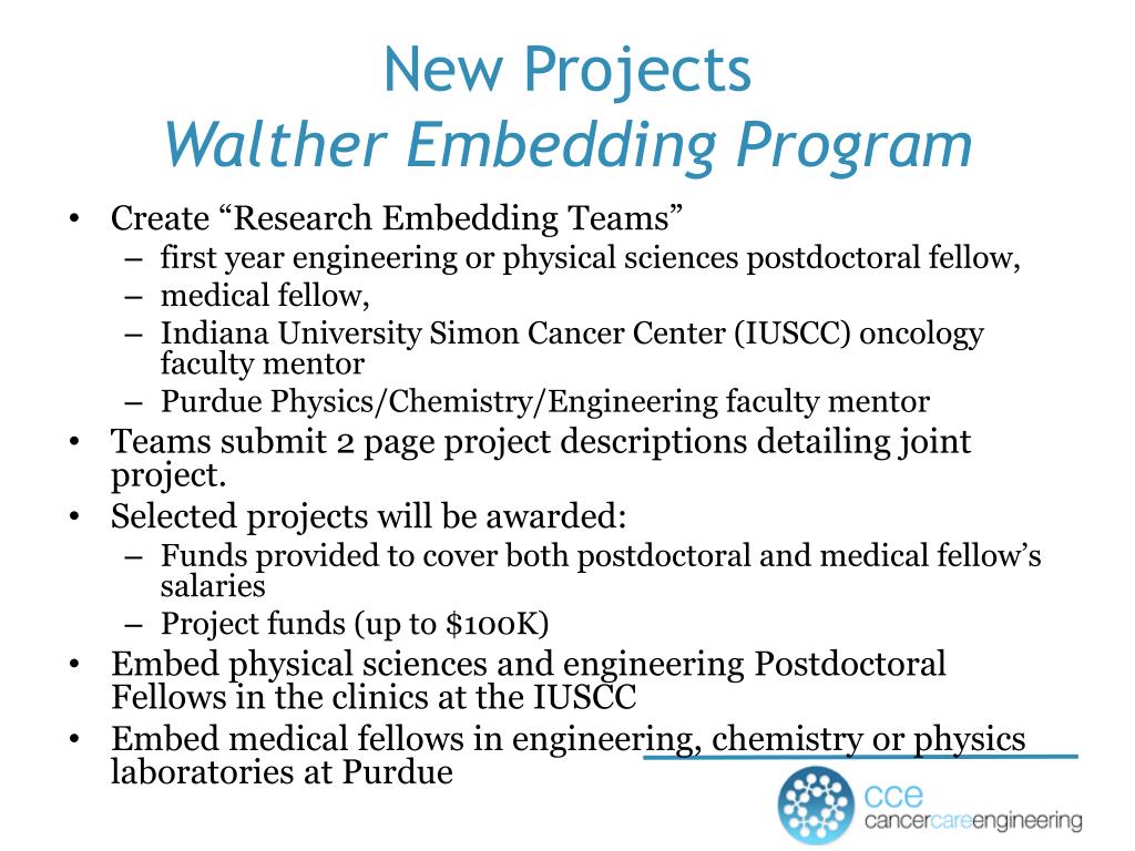 New ProjectsWalther Embedding Program • Create “Research Embedding Teams” • first year engineering or physical sciences postdoctoral fellow, • medical fellow, • Indiana University Simon Cancer Center (IUSCC) oncology faculty mentor • Purdue Physics/Chemistry/Engineering faculty mentor • Teams submit 2 page project descriptions detailing joint project. • Selected projects will be awarded: • Funds provided to cover both postdoctoral and medical fellow’s salaries • Project funds (up to $100K) • Embed physical sciences and engineering Postdoctoral Fellows in the clinics at the IUSCC • Embed medical fellows in engineering, chemistry or physics laboratories at Purdue