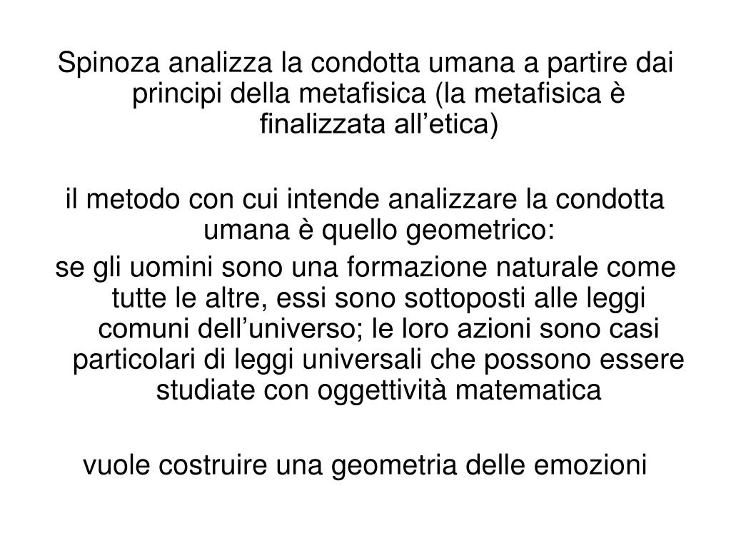 Spinoza analizza la condotta umana a partire dai principi della metafisica (la metafisica è finalizzata all’etica) il metodo con cui intende analizzare la condotta umana è quello geometrico: se gli uomini sono una formazione naturale come tutte le altre, essi sono sottoposti alle leggi comuni dell’universo; le loro azioni sono casi particolari di leggi universali che possono essere studiate con oggettività matematica vuole costruire una geometria delle emozioni