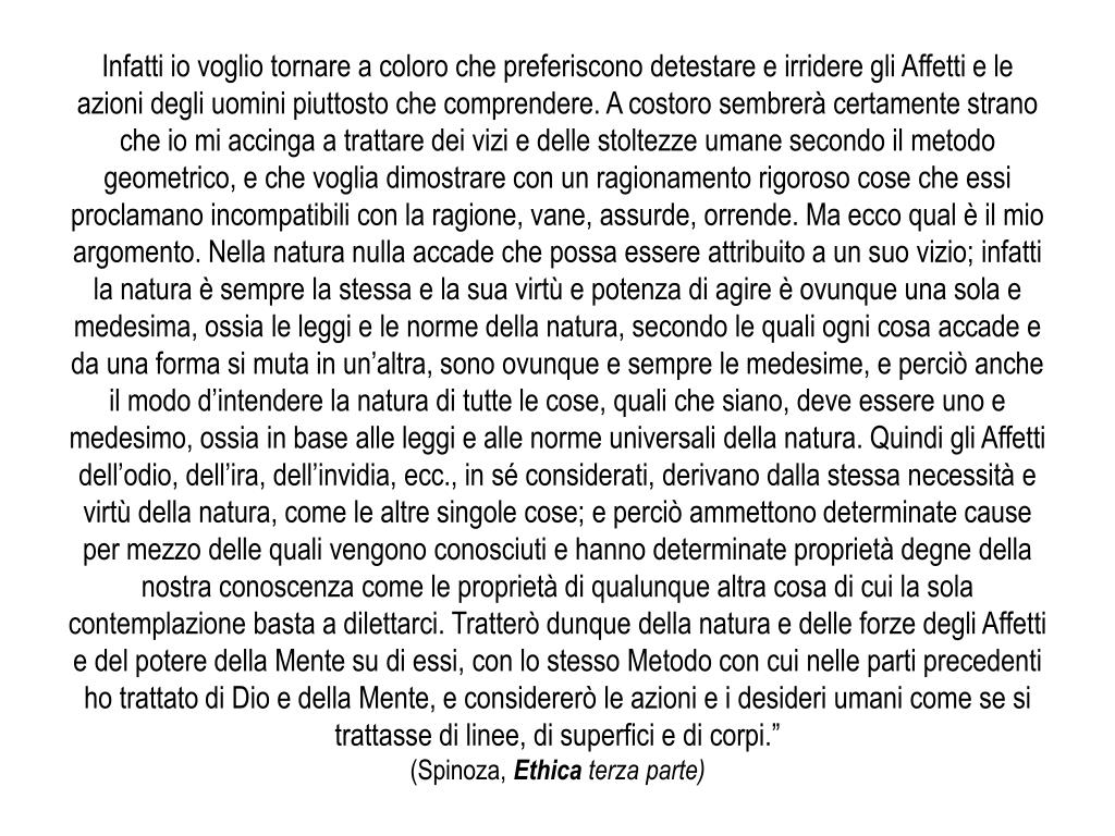 Infatti io voglio tornare a coloro che preferiscono detestare e irridere gli Affetti e le azioni degli uomini piuttosto che comprendere. A costoro sembrerà certamente strano che io mi accinga a trattare dei vizi e delle stoltezze umane secondo il metodo geometrico, e che voglia dimostrare con un ragionamento rigoroso cose che essi proclamano incompatibili con la ragione, vane, assurde, orrende. Ma ecco qual è il mio argomento. Nella natura nulla accade che possa essere attribuito a un suo vizio; infatti la natura è sempre la stessa e la sua virtù e potenza di agire è ovunque una sola e medesima, ossia le leggi e le norme della natura, secondo le quali ogni cosa accade e da una forma si muta in un’altra, sono ovunque e sempre le medesime, e perciò anche il modo d’intendere la natura di tutte le cose, quali che siano, deve essere uno e medesimo, ossia in base alle leggi e alle norme universali della natura. Quindi gli Affetti dell’odio, dell’ira, dell’invidia, ecc., in sé considerati, derivano dalla stessa necessità e virtù della natura, come le altre singole cose; e perciò ammettono determinate cause per mezzo delle quali vengono conosciuti e hanno determinate proprietà degne della nostra conoscenza come le proprietà di qualunque altra cosa di cui la sola contemplazione basta a dilettarci. Tratterò dunque della natura e delle forze degli Affetti e del potere della Mente su di essi, con lo stesso Metodo con cui nelle parti precedenti ho trattato di Dio e della Mente, e considererò le azioni e i desideri umani come se si trattasse di linee, di superfici e di corpi.” (Spinoza, Ethica terza parte)