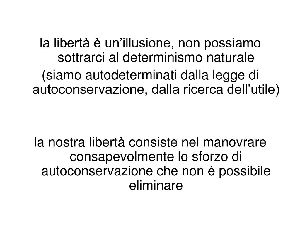 la libertà è un’illusione, non possiamo sottrarci al determinismo naturale (siamo autodeterminati dalla legge di autoconservazione, dalla ricerca dell’utile) la nostra libertà consiste nel manovrare consapevolmente lo sforzo di autoconservazione che non è possibile eliminare