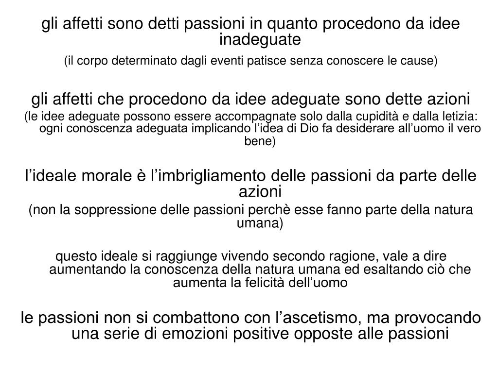 gli affetti sono detti passioni in quanto procedono da idee inadeguate (il corpo determinato dagli eventi patisce senza conoscere le cause) gli affetti che procedono da idee adeguate sono dette azioni (le idee adeguate possono essere accompagnate solo dalla cupidità e dalla letizia: ogni conoscenza adeguata implicando l’idea di Dio fa desiderare all’uomo il vero bene) l’ideale morale è l’imbrigliamento delle passioni da parte delle azioni (non la soppressione delle passioni perchè esse fanno parte della natura umana) questo ideale si raggiunge vivendo secondo ragione, vale a dire aumentando la conoscenza della natura umana ed esaltando ciò che aumenta la felicità dell’uomo le passioni non si combattono con l’ascetismo, ma provocando una serie di emozioni positive opposte alle passioni