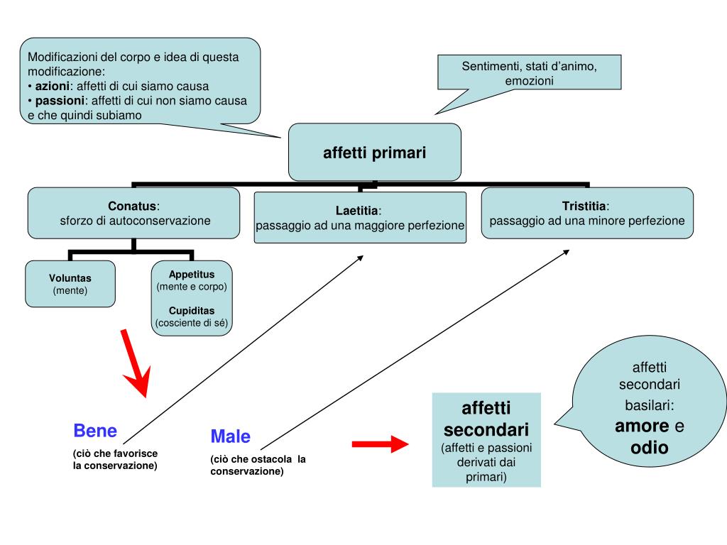Modificazioni del corpo e idea di questa modificazione: • azioni: affetti di cui siamo causa • passioni: affetti di cui non siamo causa e che quindi subiamo Sentimenti, stati d’animo, emozioni affetti secondari basilari:amore e odio affetti secondari(affetti e passioni derivati dai primari) Bene (ciò che favorisce la conservazione) Male (ciò che ostacola la conservazione)