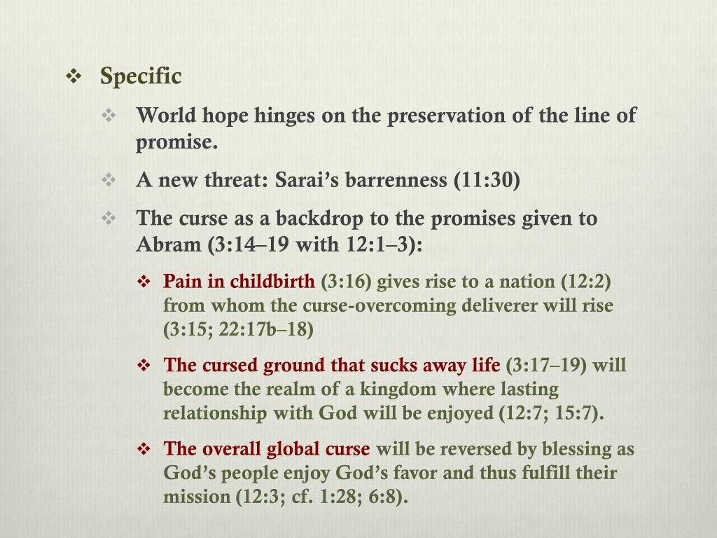 Specific • World hope hinges on the preservation of the line of promise. • A new threat: Sarai’s barrenness (11:30) • The curse as a backdrop to the promises given to Abram (3:14–19 with 12:1–3): • Pain in childbirth (3:16) gives rise to a nation (12:2) from whom the curse-overcoming deliverer will rise (3:15; 22:17b–18) • The cursed ground that sucks away life (3:17–19) will become the realm of a kingdom where lasting relationship with God will be enjoyed (12:7; 15:7). • The overall global curse will be reversed by blessing as God’s people enjoy God’s favor and thus fulfill their mission (12:3; cf. 1:28; 6:8).