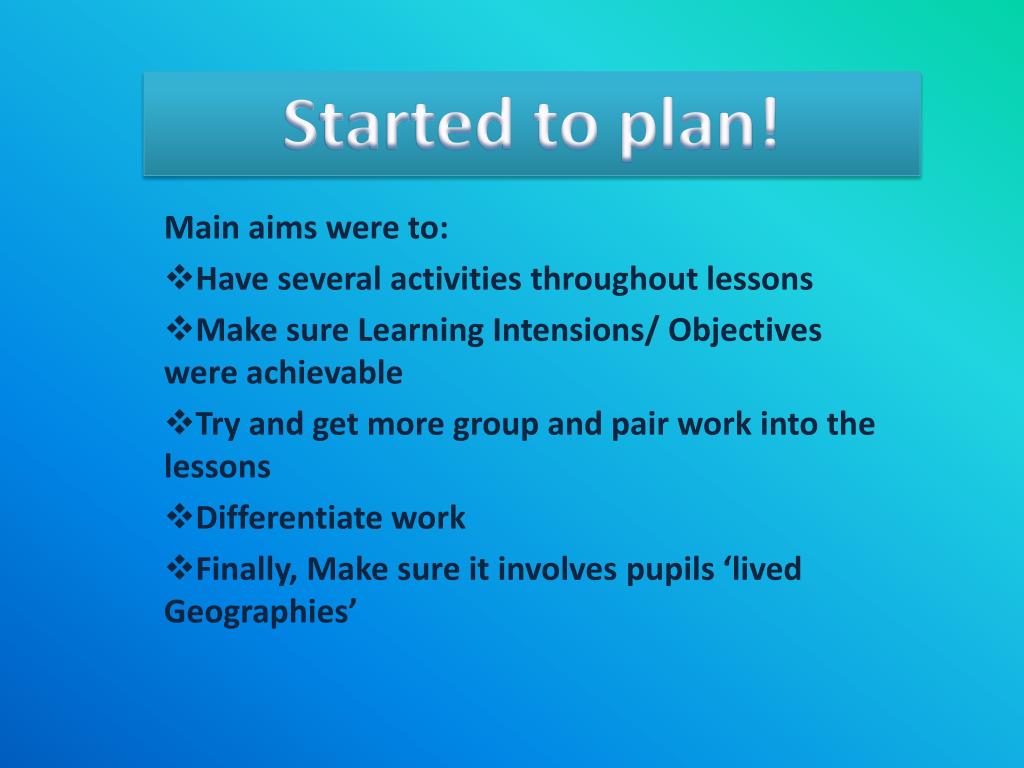 Started to plan! Main aims were to: Have several activities throughout lessons Make sure Learning Intensions/ Objectives were achievable Try and get more group and pair work into the lessons Differentiate work Finally, Make sure it involves pupils ‘lived Geographies’