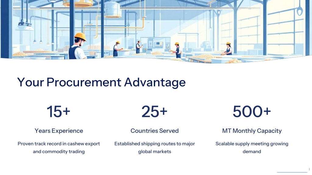 Your Procurement Advantage 15+ 25+ 500+ Years Experience Countries Served MT Monthly Capacity Proven track record in cashew export and commodity trading Established shipping routes to major global markets Scalable supply meeting growing demand