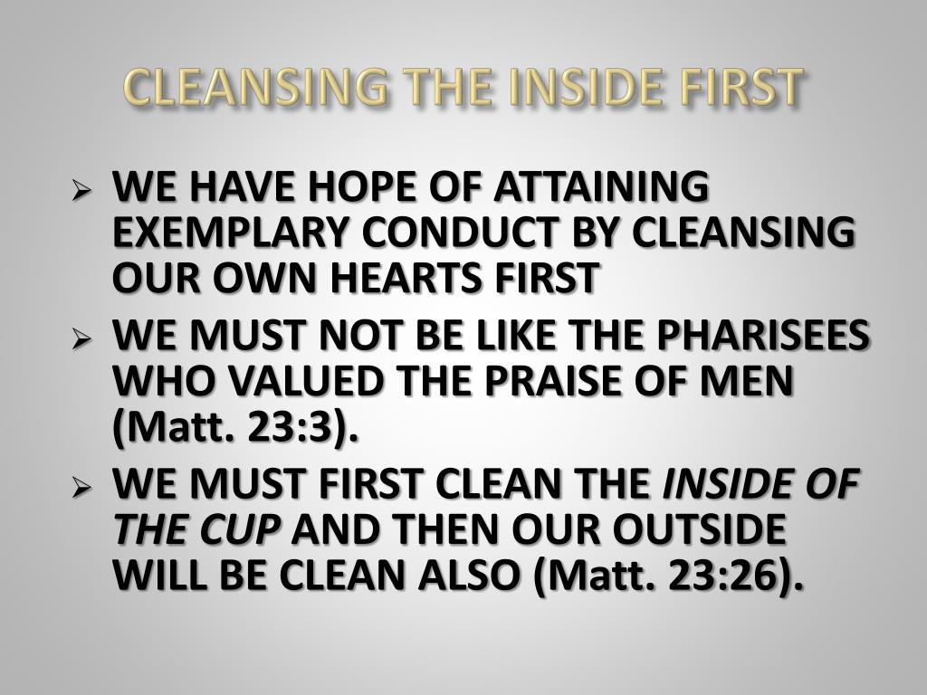CLEANSING THE INSIDE FIRST • WE HAVE HOPE OF ATTAINING EXEMPLARY CONDUCT BY CLEANSING OUR OWN HEARTS FIRST • WE MUST NOT BE LIKE THE PHARISEES WHO VALUED THE PRAISE OF MEN (Matt. 23:3). • WE MUST FIRST CLEAN THE INSIDE OF THE CUP AND THEN OUR OUTSIDE WILL BE CLEAN ALSO (Matt. 23:26).