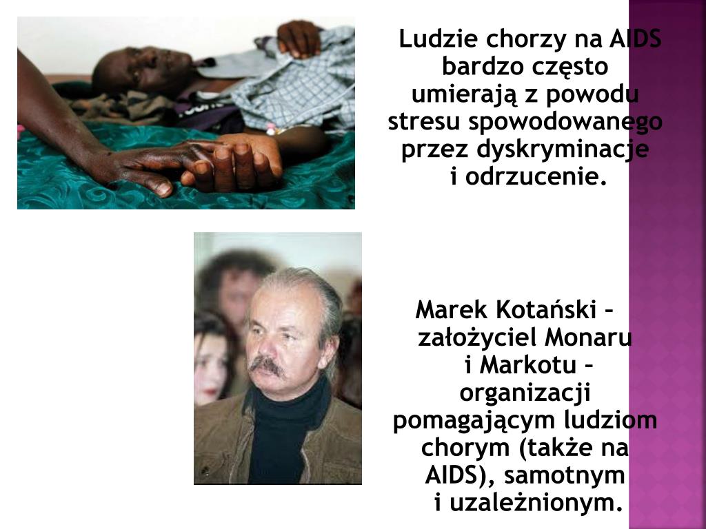 Ludzie chorzy na AIDS bardzo często umierają z powodu stresu spowodowanego przez dyskryminacje i odrzucenie. Marek Kotański – założyciel Monaru i Markotu – organizacji pomagającym ludziom chorym (także na AIDS), samotnymi uzależnionym.