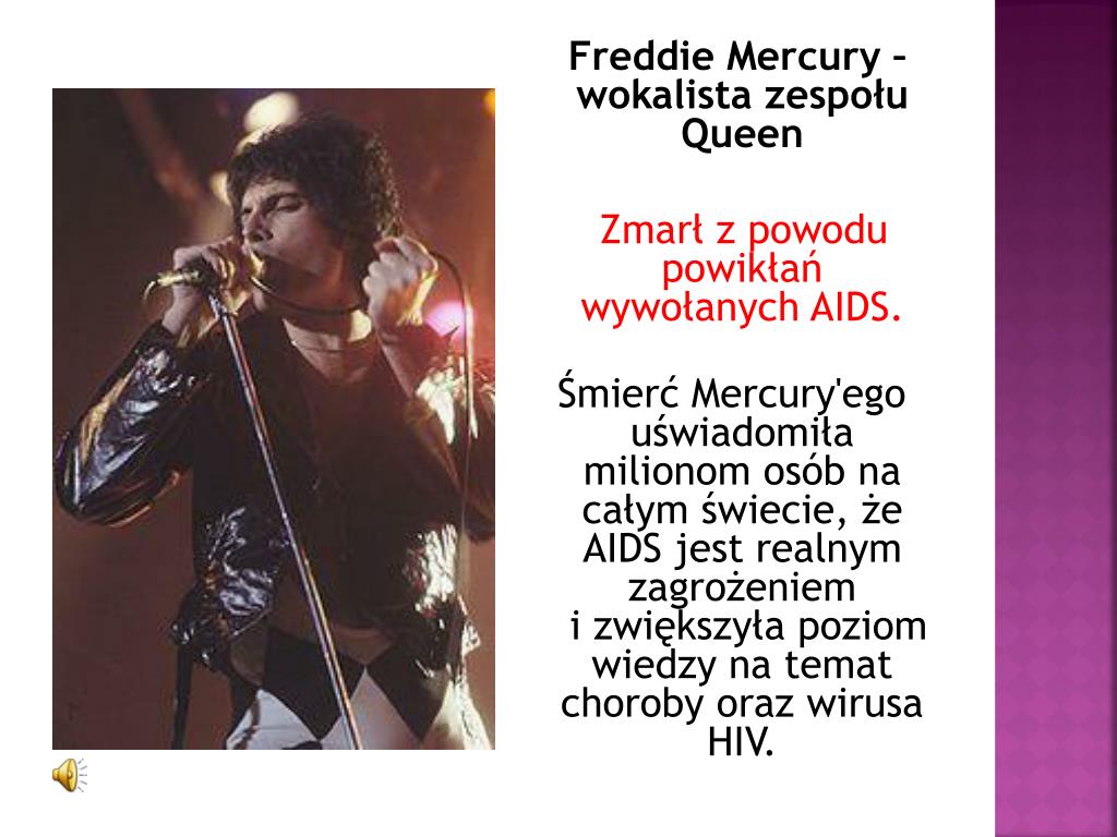 Freddie Mercury –wokalista zespołu Queen Zmarł z powodu powikłań wywołanych AIDS. Śmierć Mercury'ego uświadomiła milionom osób na całym świecie, że AIDS jest realnym zagrożeniem i zwiększyła poziom wiedzy na temat choroby oraz wirusa HIV.