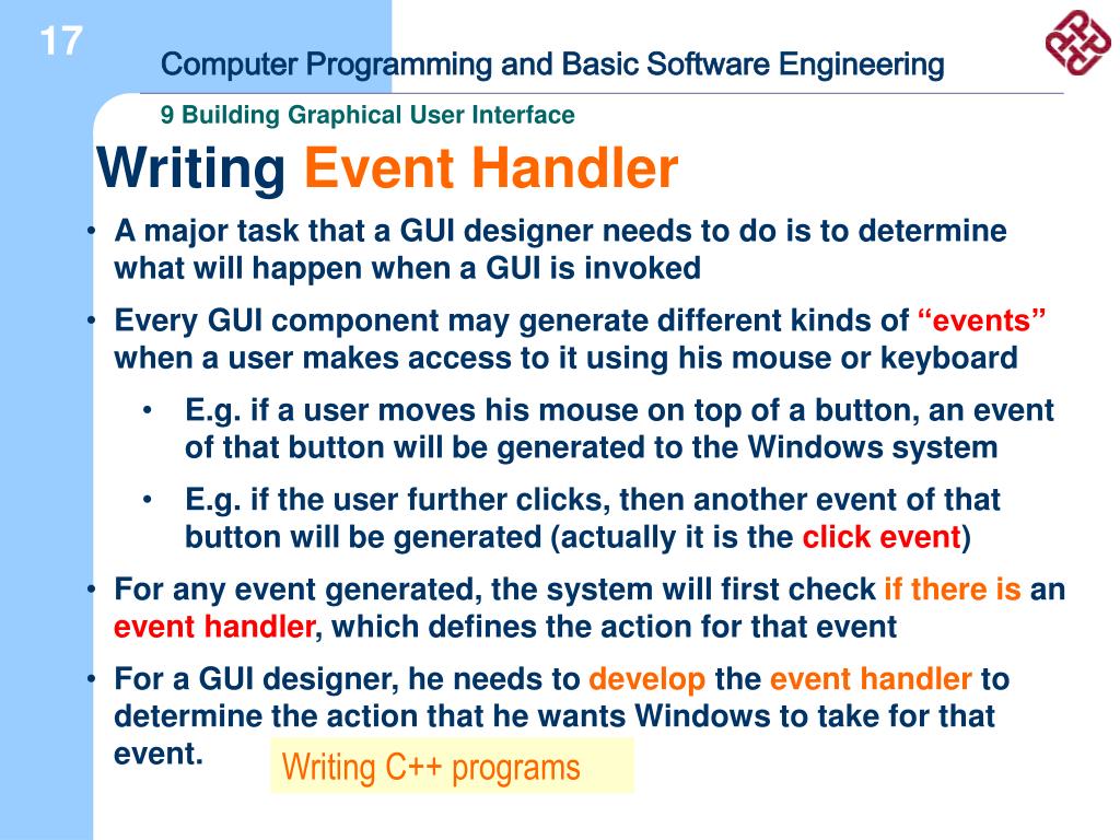 Writing Event Handler • A major task that a GUI designer needs to do is to determine what will happen when a GUI is invoked • Every GUI component may generate different kinds of “events” when a user makes access to it using his mouse or keyboard • E.g. if a user moves his mouse on top of a button, an event of that button will be generated to the Windows system • E.g. if the user further clicks, then another event of that button will be generated (actually it is the click event) • For any event generated, the system will first check if there is an event handler, which defines the action for that event • For a GUI designer, he needs to develop the event handler to determine the action that he wants Windows to take for that event. Writing C++ programs