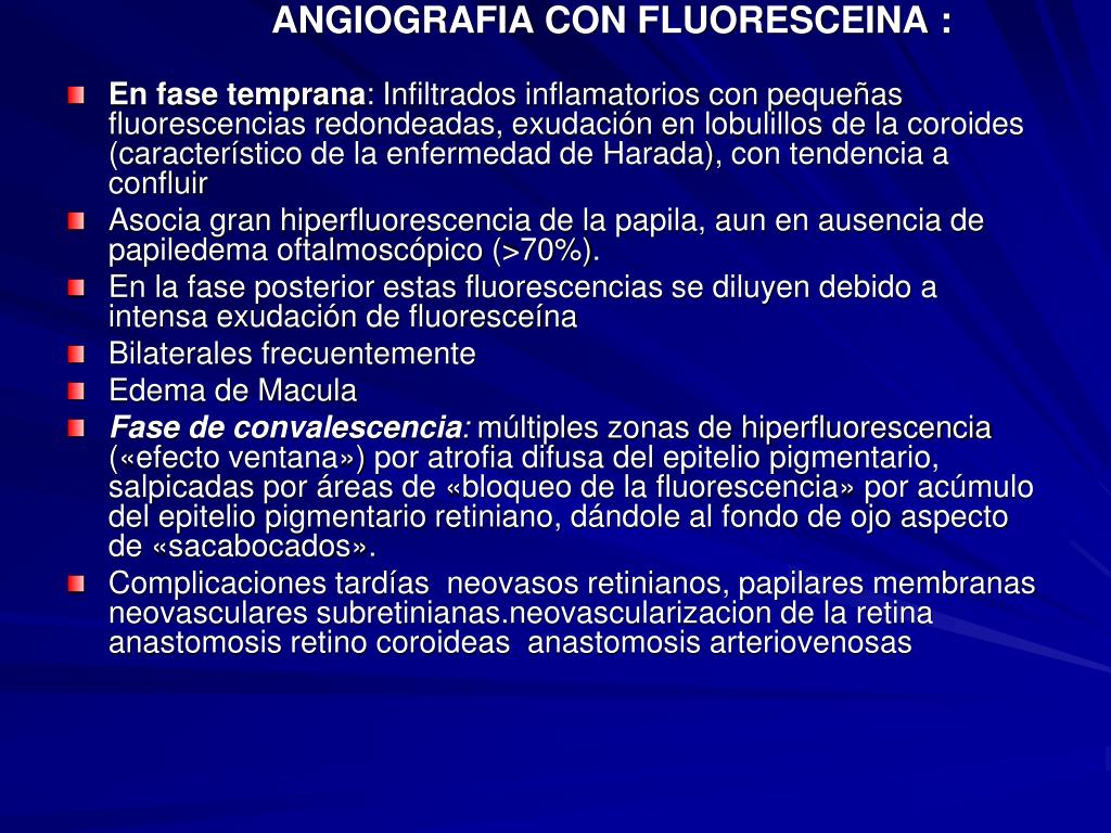 ANGIOGRAFIA CON FLUORESCEINA : • En fase temprana: Infiltrados inflamatorios con pequeñas fluorescencias redondeadas, exudación en lobulillos de la coroides (característico de la enfermedad de Harada), con tendencia a confluir • Asocia gran hiperfluorescencia de la papila, aun en ausencia de papiledema oftalmoscópico (>70%). • En la fase posterior estas fluorescencias se diluyen debido a intensa exudación de fluoresceína • Bilaterales frecuentemente • Edema de Macula • Fase de convalescencia: múltiples zonas de hiperfluorescencia («efecto ventana») por atrofia difusa del epitelio pigmentario, salpicadas por áreas de «bloqueo de la fluorescencia» por acúmulo del epitelio pigmentario retiniano, dándole al fondo de ojo aspecto de «sacabocados». • Complicaciones tardías neovasos retinianos, papilares membranas neovasculares subretinianas.neovascularizacion de la retina anastomosis retino coroideas anastomosis arteriovenosas