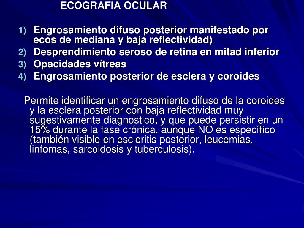 ECOGRAFIA OCULAR • Engrosamiento difuso posterior manifestado por ecos de mediana y baja reflectividad) • Desprendimiento seroso de retina en mitad inferior • Opacidades vítreas • Engrosamiento posterior de esclera y coroides Permite identificar un engrosamiento difuso de la coroides y la esclera posterior con baja reflectividad muy sugestivamente diagnostico, y que puede persistir en un 15% durante la fase crónica, aunque NO es específico (también visible en escleritis posterior, leucemias, linfomas, sarcoidosis y tuberculosis).