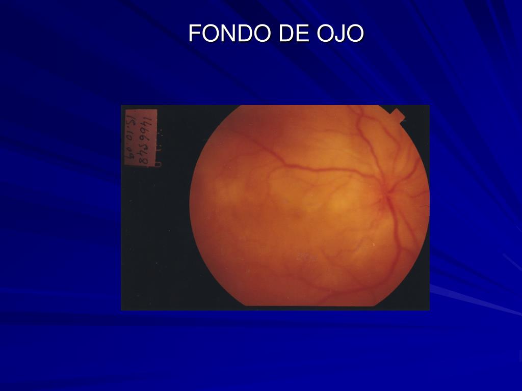 28/9/09 Disminución agudeza visual bilateral de instalación brusca • EXAMEN NEUROLOGICO: Ambliopía Bilateral Severa. Signo de Marcus Gunn. Edema de Papila bilateral. Hipoacusia derecha de perfil sensorial. FONDO DE OJO: EDEMA DE PAPILA BILATERAL, DESPRENDIMIENTO EXUDATIVO DE RETINA BILATERAL